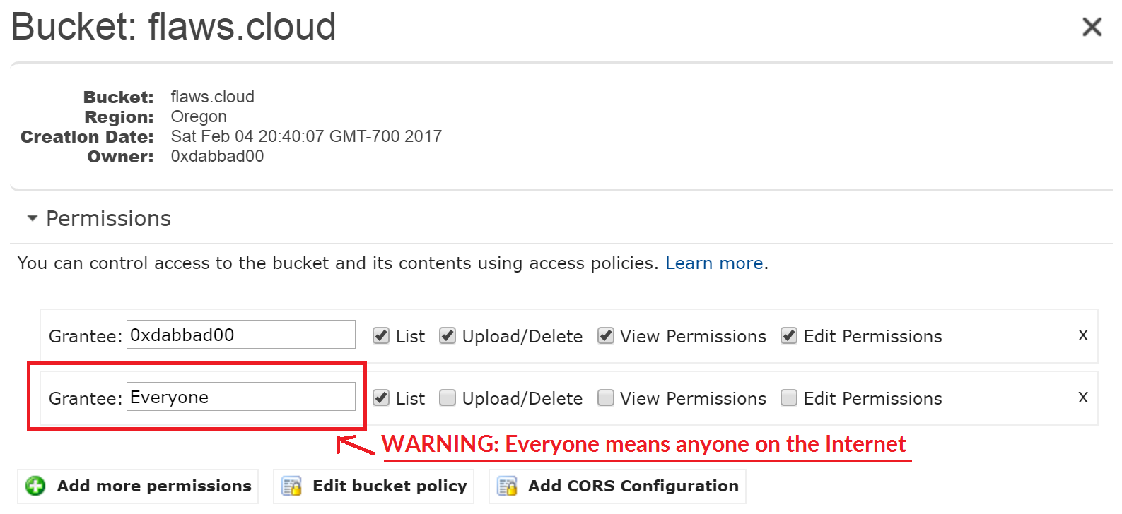 "Everyone" means everyone on the Internet. You can also list the files simply by going to <http://flaws.cloud.s3.amazonaws.com/> due to that List permission.